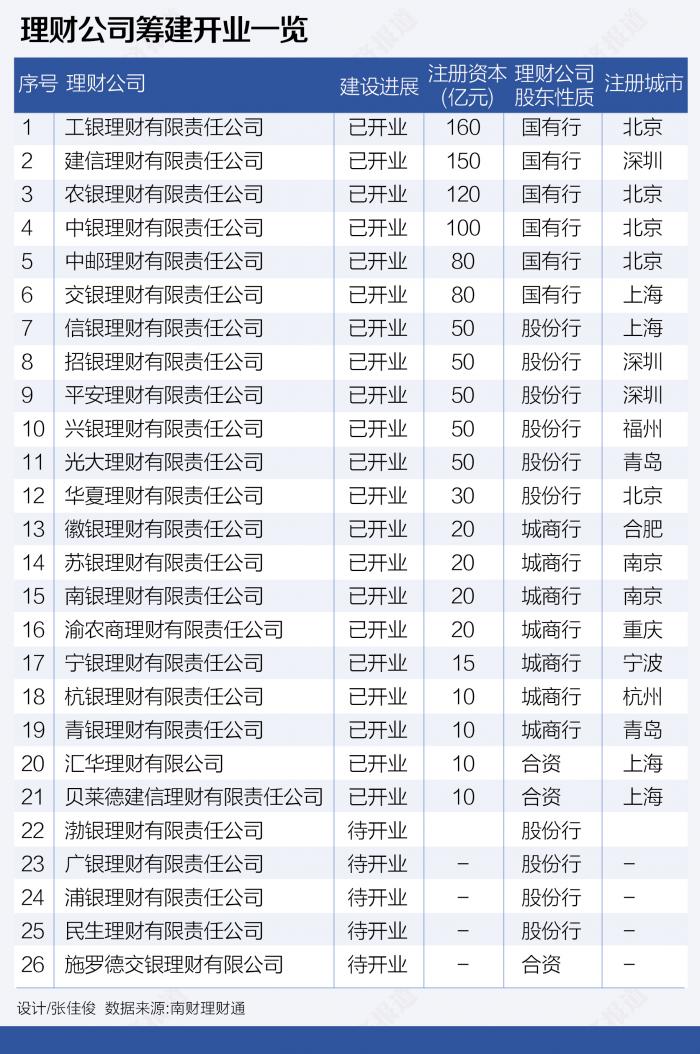 据南财理财通数据,目前获批筹建的内地理财公司共有26家,其中银行理财子公司有23家;合资理财孙公司有3家,分别为汇华理财有限公司、贝莱德建信理财有限责任公司和施罗德交银理财有限公司。