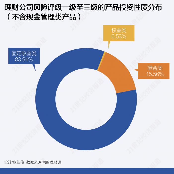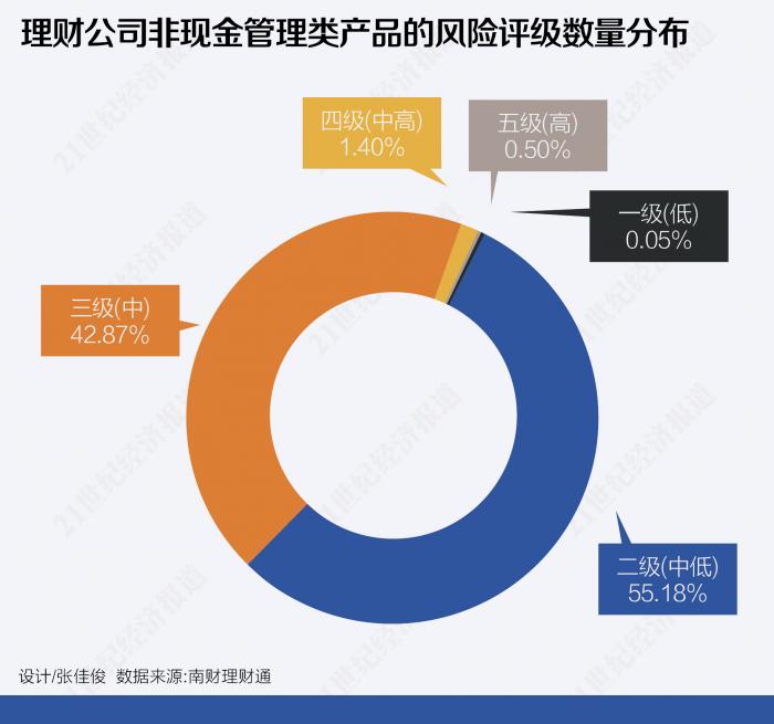 根据南财理财通数据,截至2021年5月20日,在剔除现金管理类产品及同一产品登记编码下对子份额的重复统计后,理财公司共有产品6550只(含母行迁移产品),其中风险评级为一级(低)的有3只,占比0.05%;风险评级为二级(中低)的有3614只,占比55.18%;风险评级为三级(中)的有2808只,占比42.87%;风险评级为四级(中高)的有92只,占比1.40%;风险评级为五级(高)的有33只,占比0.50%。其中,风险评级在一级至三级的产品合计6425只,占比98.1%,即理财公司发行的绝大多数产品均可进入“北向通”产品体系。