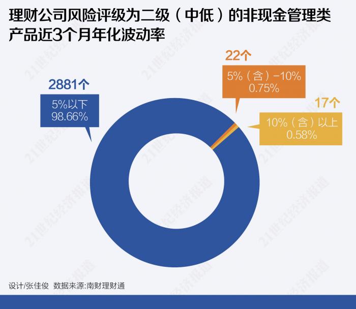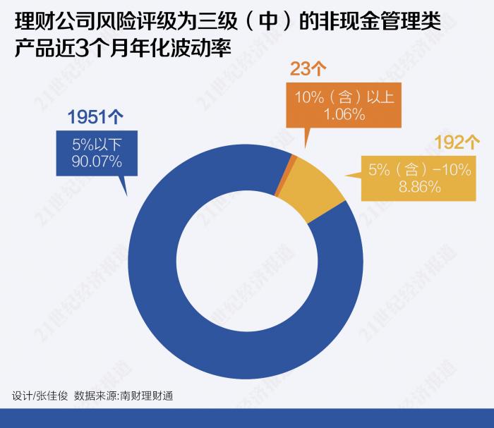 就波动率指标而言,截至5月20日,在风险评级为二级(中低)的非现金管理类产品中,取理财子公司和理财孙公司的有效样本2920个,近3个月年化波动率在10%(含)以上的有17个,占比0.58%;近3个月年化波动率在5%(含)-10%之间的有22个,占比0.75%;近3个月年化波动率在5%以下的有2881个,占比98.66%。在风险评级为三级(中)的非现金管理类产品中,课题组取有效样本2166个,近3个月年化波动率在10%(含)以上的有23个,占比1.06%;近3个月年化波动率在5%(含)-10%之间的有192个,占比8.86%;近3个月年化波动率在5%以下的有1951个,占比90.07%。