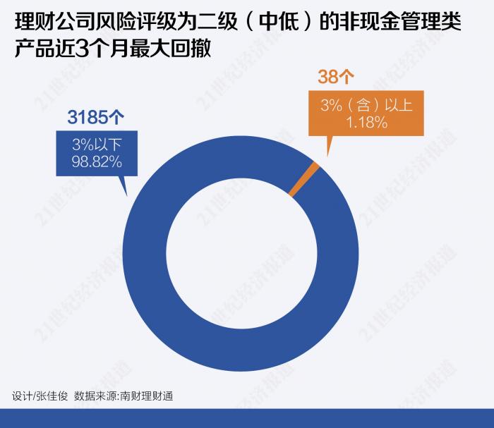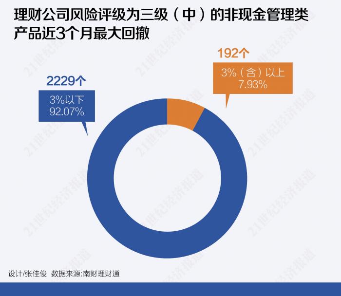 就最大回撤指标而言,在风险评级为二级(中低)的非现金管理类产品中,取有效样本3223个,近3个月最大回撤在3%(含)以上的有38个,占比1.18%;近3个月最大回撤在3%以下的有3185个,占比98.82%。在风险评级为三级(中)的非现金管理类产品中,取有效样本2421个,近3个月最大回撤在3%(含)以上的有192个,占比7.93%;近3个月最大回撤在3%以下的有2229个,占比92.07%。