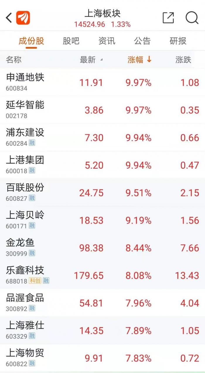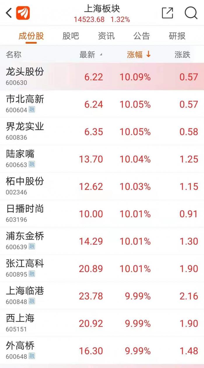 6月3日,上海本地股午后上演涨停潮。截至下午13:15,龙头股份,市北高新、界龙实业、陆家嘴、柘中股份、日播时尚、浦东金桥、张江高科等多股涨幅超过10%,上海临港、西上海、外高桥、申通地铁、延华智能、浦东建设等多股涨超9%。共有近50股涨超5%。