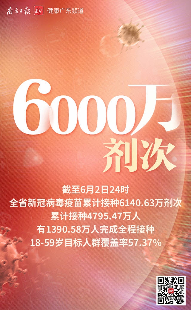 截至6月2日24时,当日全省新增接种252.47万剂次,全省累计接种6140.63万剂次,累计接种4795.47万人,共有1390.58万人完成全程接种,全人群全程接种覆盖率11.04%。18-59岁目标人群累计接种4763.08万人,至少接种1剂目标人群覆盖57.37%。