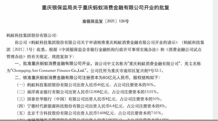 根据批复,重庆蚂蚁消费金融有限公司注册资本为80亿元人民币,其中蚂蚁科技集团股份有限公司出资人民币40亿元,占公司注册资本的50%;南洋商业银行出资12.008亿元,占比为15.01%;国泰世华银行(中国)有限公司出资8亿元,占比10%;宁德时代出资近6.5亿元,占比8%;北京千方科技股份有限公司出资5.608亿元,占比7.01%;中国华融资产管理股份有限公司出资;3.992亿元,占比4.99%;江苏鱼跃医疗设备股份有限公司出资3.992亿元,占比4.99%。