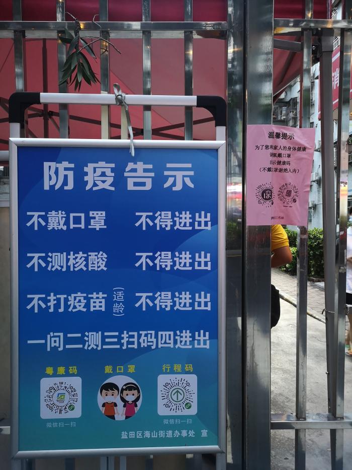 盐田区居民已完成三轮全员核酸检测,周五将进行第四轮全员核酸检测。盐田各地铁口均要求出示健康码及测体温。盐田区所有小区防疫规定:不戴口罩不得进入,不测核酸不得进入,不打疫苗(适龄)不得进入,一问二测三扫码四进入。