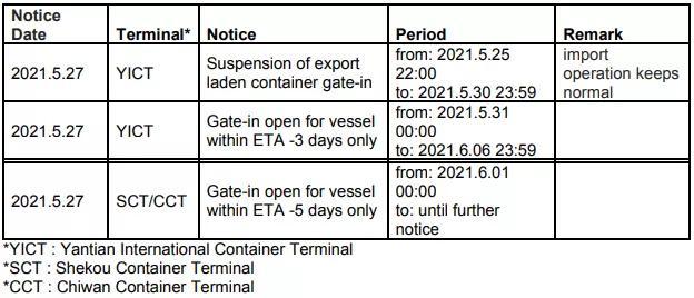 Ocean Network Express (ONE)日前也发布公告,随着深圳盐田国际集装箱码头(YICT)堆场密度越来越大,该港口的拥堵正在加剧。其出口进港作业暂停和调整如下: