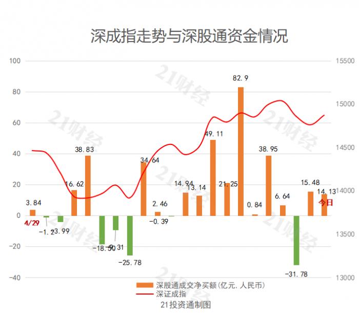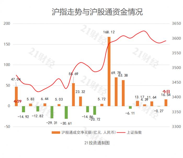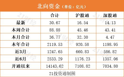 据21投资通(微信号ID:touzit21)智能监测,今日,北向资金盘中一度净流入超过63亿元,但在午后转为流出,全天流入净额收窄至30.67亿元,其中沪股通和深股通分别净流入16.54亿元和14.13亿元。
