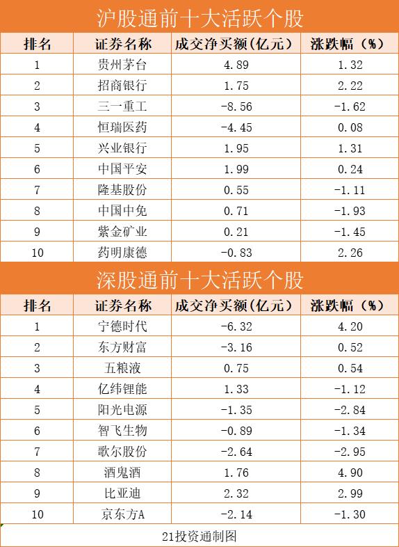 北向资金十大活跃个股方面,贵州茅台获净买入近5亿元。此外,比亚迪、中国平安分别获净买入2.32亿元、1.99亿元。三一重工净卖出额居首,金额为8.56亿元。