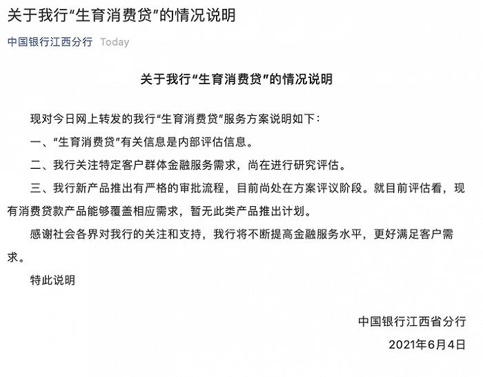 今日晚间,中国银行江西省分行在其官方微信公众号发布情况说明称,“生育消费贷”有关信息是内部评估信息,“我行新产品推出有严格的审批流程,目前尚处在方案评议阶段。就目前评估看,现有消费贷款产品能够覆盖相应需求,暂无此类产品推出计划。”