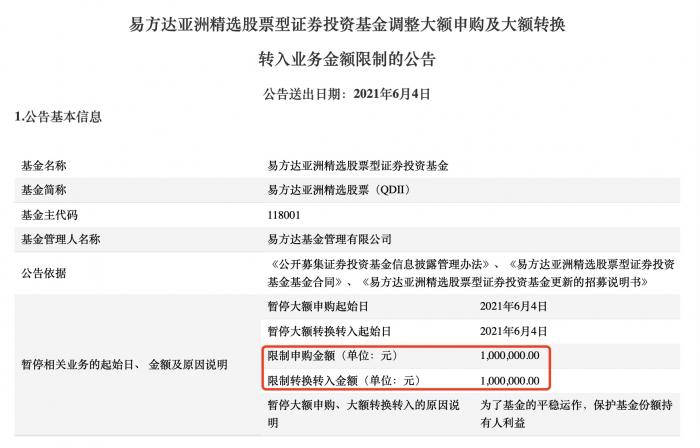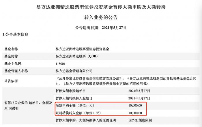 就在8天前的5月27日,易方达亚洲精选也曾发布了一条暂停大额申购及大额转换转入业务的公告,公告称,从5月27日起暂停在全部销售机构的大额申购、大额转换转入业务,单日单个基金账户累计申购(含定期定额投资及转换转入,下同)金额不超过1万元。