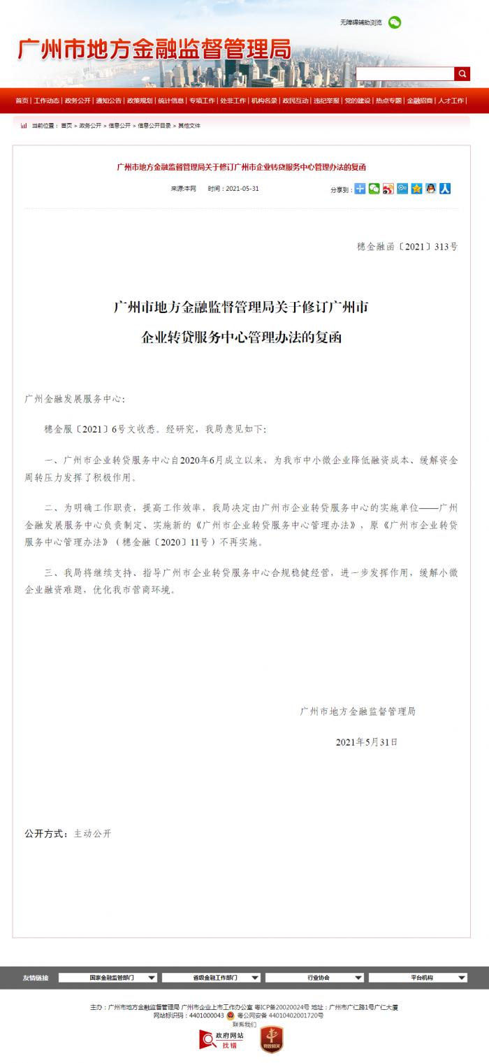 近日,广州市地方金融监督管理局正式批复同意新修订的《广州市企业转贷服务中心暂行管理办法》(以下简称《管理办法》),由广州市企业转贷服务中心(以下简称为转贷服务中心)实施单位——广州金融发展服务中心负责制定、实施,原《广州市企业转贷服务中心管理办法》(穗金融〔2020〕11号)不再实施,即日生效。