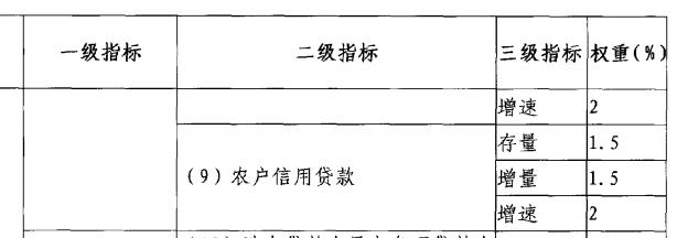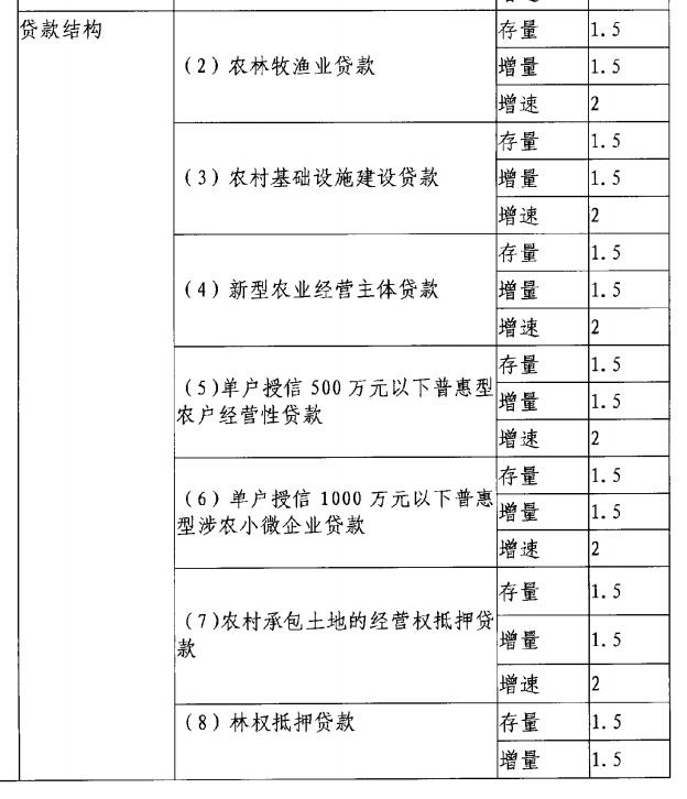 《办法》显示,对于上述五类定量、五类定性一级指标,均设置了相应的二级指标和三级指标。如贷款总量设置了存量、增量、增速3个三级指标,贷款结构设置了农林牧渔业贷款、农村基础设施建设贷款、新型农业经营主体贷款等8个二级指标,三级指标相同,均为存量、增量、增速。
