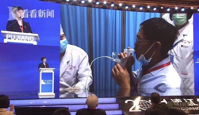 一名参加临床试验的武汉市民吸入从设备中喷出的雾化疫苗,
