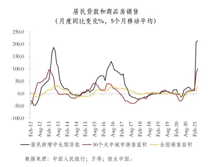 信贷投放总额增速在进入2021年后不断下降,但是家庭贷款增速却居高不下。4月份家庭贷款总额同比增长15.9%,两年年化增长也高于2019和2020年的所有月份。这意味着房地产销售周期可能仍在上行。这是我们在过去十年中第三次观察到这种急速上行的趋势,之前两次分别发生在2013年和2016年。