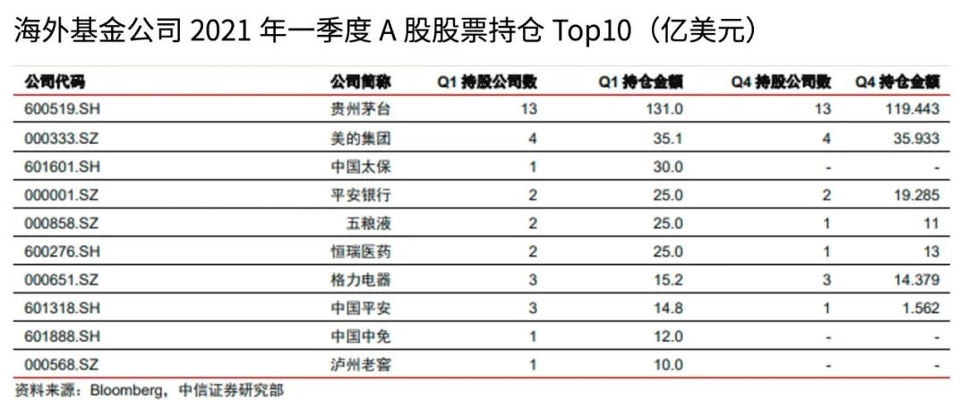 事实上,以贵州茅台为代表的消费板块一直是大型外资机构的心头好。中信证券对持有中国股票的20家Top基金公司前20大重仓股统计分析发现,从A股市场标的来看,消费公司依然占据主导地位,主要集中在白酒和家电板块,其中,贵州茅台已连续多个季度持仓金额位列第一。