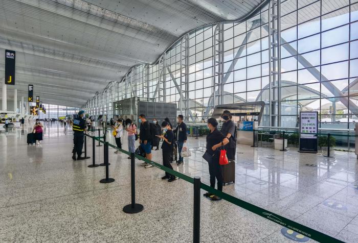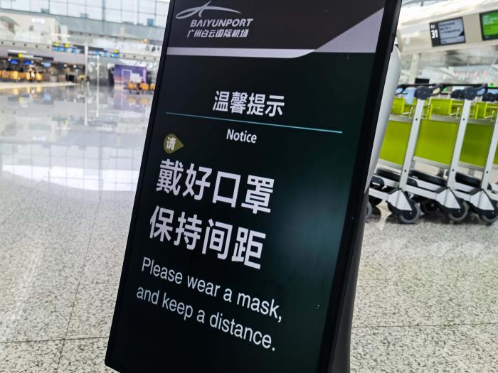 记者于5日下午来到广州白云国际机场。现场的防疫措施做得相当到位:从进大门到值机到安检再到候机,累计需出示三次“健康码”绿码;工作人员对入闸处旅客进行测温与发放消毒液等工作。