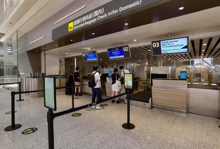 出于疫情防控需要,旅客需要人工值机,往日需要排队的自助值机柜现变得无人问津。