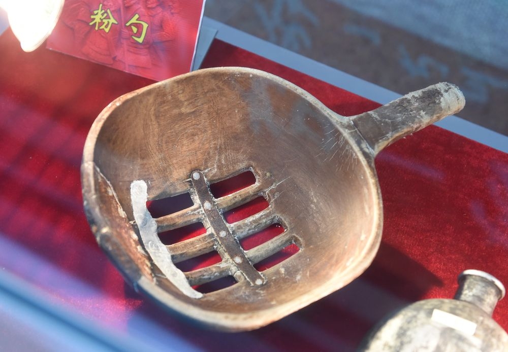 △在宁夏西吉县将台堡红军长征会师纪念园内的三军会师纪念馆里展出的当年红军用过的粉勺(2019年8月11日摄)。新华社记者罗晓光摄