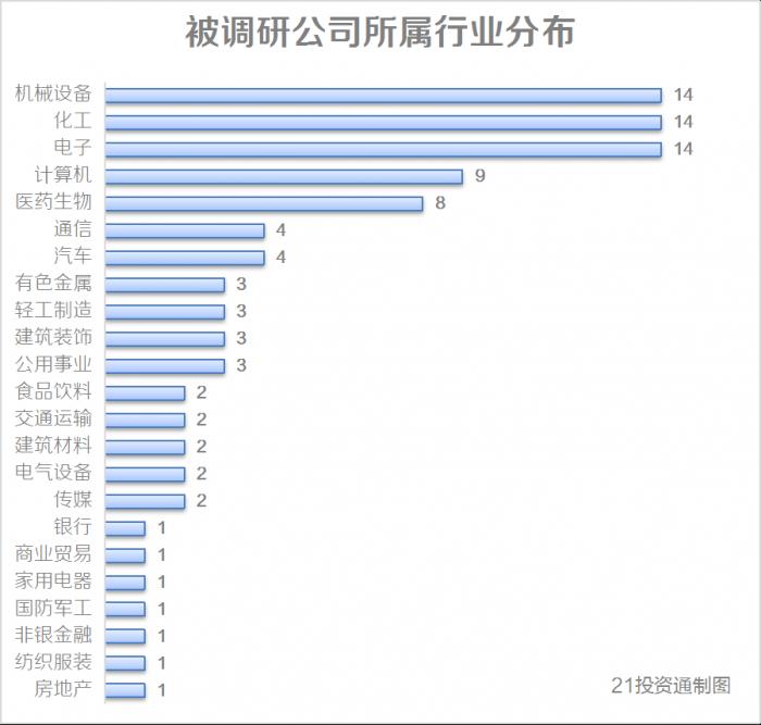 从行业分布来看,机械设备、化工、电子最受机构青睐,均有14家公司获调研,包括 京东方A(000725.SZ)、华中数控(300161.SZ)、洪汇新材(002802.SZ)、天原股份(002386.SZ)等。