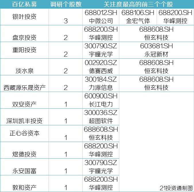 从具体调研机构来看,重阳投资、淡水泉等11家百亿级私募调研了10家公司。除了华峰测控,恒玄科技最受百亿私募关注,吸引了包括盘京投资、敦和资产等4家私募调研。