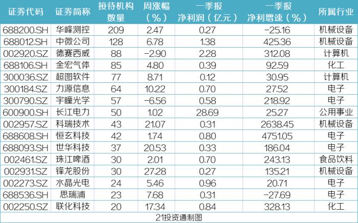 接待机构数量方面,半导体板块人气龙头华峰测控(688200.SH)成为最受机构青睐的个股,获209家机构扎堆调研。此外中微公司(688012.SH)也获超100家机构调研。