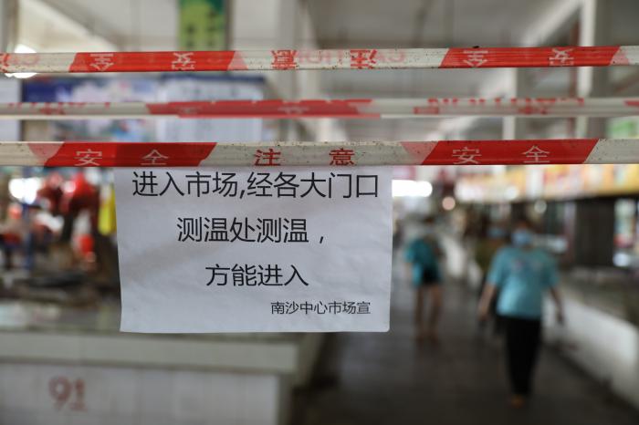 6月6日下午,在位于南沙街旧镇的区中心市场内,鸡蛋、蔬菜、水果等供应充足。而进出市场口均需要在保安处扫健康码并进行体温测量,同时保安还会提醒顾客记得戴好口罩并保持间距。