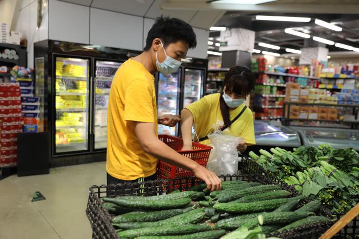 在超市的猪肉档口处,原本22元一斤的瘦肉特价19.9元一斤出售。猪肉后腿肉的价格为13.8元一斤,上肉价格为19.8元一斤。蔬菜的价格大多数在每斤3到6元左右。超市的货架上食物和生活用品等供应充足,市民在收银处隔着安全距离排队有序结账,并没有出现哄抢商品的情况。