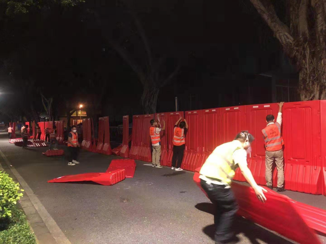 施工期间,广州建筑领导班子连夜部署,靠前指挥,深入一线考察场地,布置落实围蔽及临时安置点工作。6月5日清晨,荔湾区政府交付的外围39公里围蔽任务已全面完成。接着,施工队伍奔赴中南街道,全速推进新增5公里的围蔽任务。