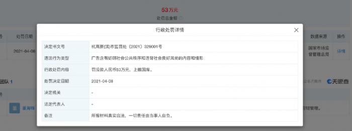 谦寻(杭州)文化传媒有限公司(下称“谦寻文化”)因广告违法案被罚53万元,引发广泛关注。国家企业信用信息公示系统显示,该公司处罚事由为“广告含有妨碍社会公共秩序和违背社会良好风尚的内容和情形”。