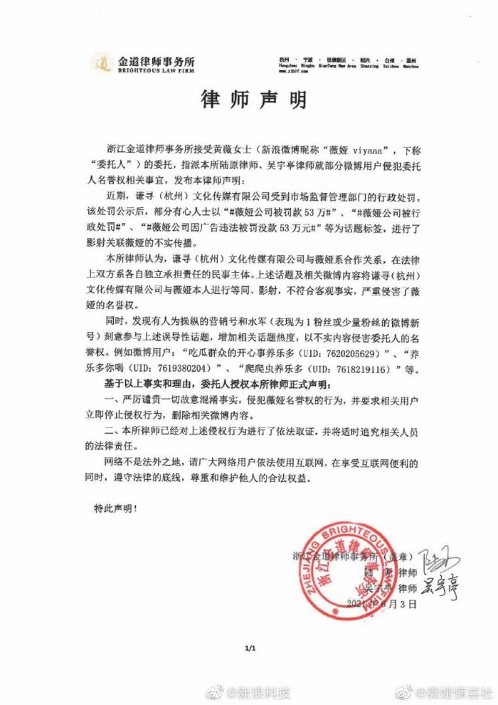 对于上述行政处罚信息,薇娅团队迅速发布声明,并与谦寻文化撇清关系。