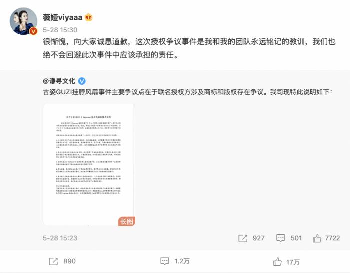 随后,品牌方谦寻文化发布声明表示,“经过核查,我们深知本次推广产品存在授权争议,我们再次向公众致歉,但古姿GUZI和我们都难以从法律层面进行维权,这是谦寻和薇娅团队成长中值得被铭记的教训。”同时指出,公司绝不回避此次授权争议中应承担的责任,已主动向有关部门说明情况,且没有删除相关直播回放。