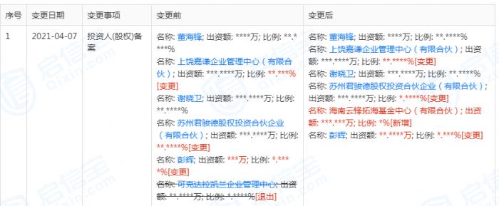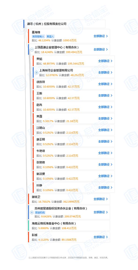 查询显示,谦寻(杭州)控股有限责任公司今年4月再度进行了工商变更,投资人新增海南云锋拓海基金中心(有限合伙),持股比例显示5%。这也就是说继君联资本入场后,知名PE云锋基金也低调入股了该公司。