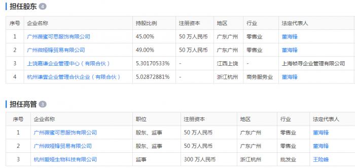 相较于薇娅而言,其丈夫董海峰则更多料理公司事务,且身份繁多。