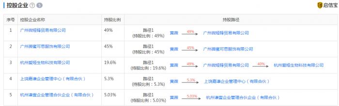公开资料显示,薇娅作为淘宝第一主播,淘宝粉丝1890万+,单场直播最高观看4300万+。同时,薇娅在多家公司担任股东、高管,旗下控股企业包括广州薇娅锋贸易有限公司等5家企业。