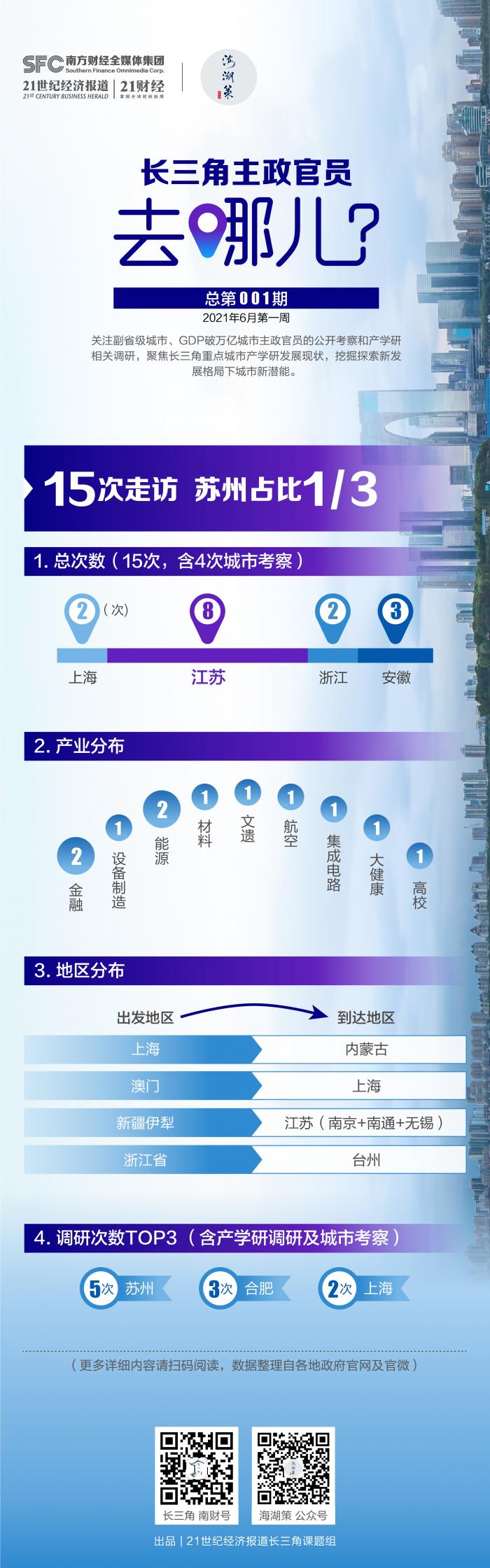 统计来看,过去一周长三角地区中江苏省产学研相关走访最多,不仅有银行、企业、研究所,还涉及遗产保护与城市协同发展。其中,江苏省委常委、苏州市委书记许昆林陆续与中国东方电气集团签约合作、会见国开行副行长何兴祥、调研中科院苏州纳米所、出席“城市遗产保护与城市发展”专家研讨会暨苏州市“文化名家单霁翔工作室”揭牌仪式和会见能源基金会首席执行官邹骥等。