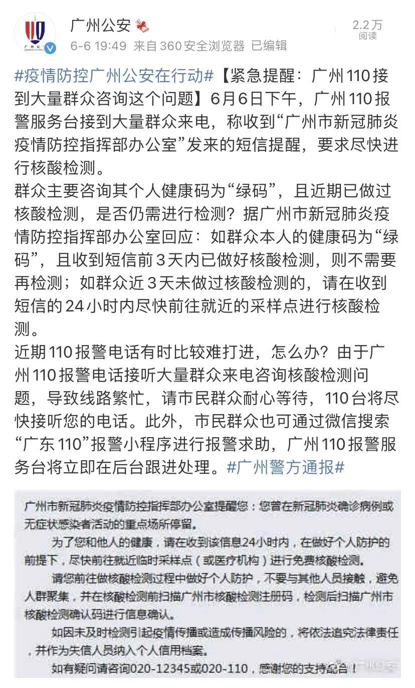 据广州公安消息,6月6日下午,广州110报警服务台接到大量群众来电,称收到“广州市新冠肺炎疫情防控指挥部办公室”发来的短信提醒,要求尽快进行核酸检测。