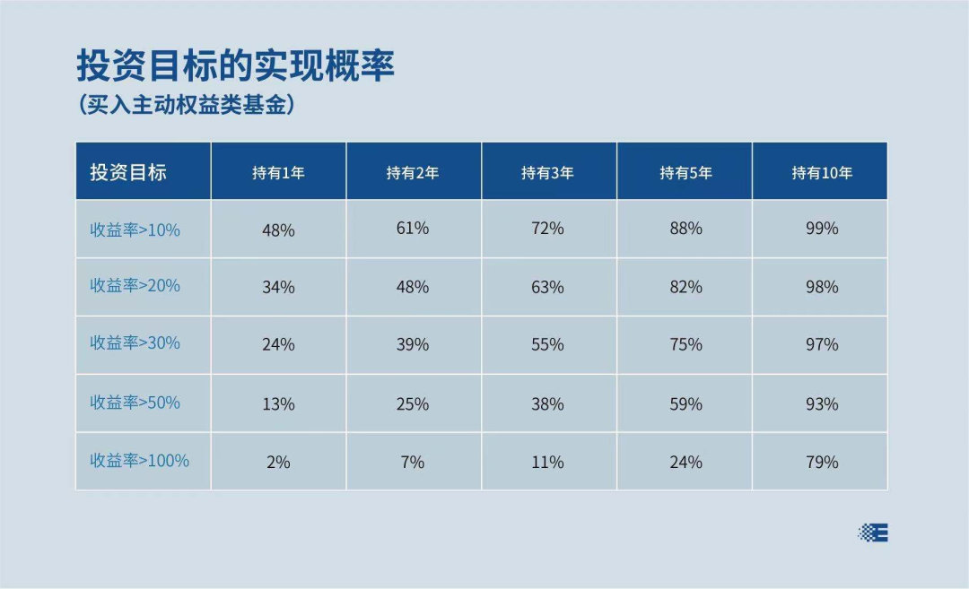 在买基金时,你给自己定下的投资收益目标是多少呢?10%?30%?越高越好?那么你知道实现自己的小目标在正常情况下需要多长时间吗?在经济环境稳定向好的背景下,通常持有主动股票基金的时间越长,实现特定收益目标的确定性(概率)越高。