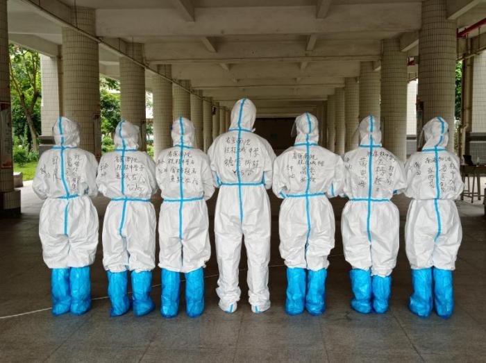 省医南海医院也是如此,他们对桂华中学、南海华附中学等进行了核酸检测,医护人员还在自己的衣物上,写上了对高考学生祝福的话语。
