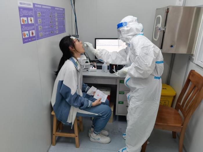 佛山禅医医护人员对高中学子进行核酸检测采样工作,院方供图,下同