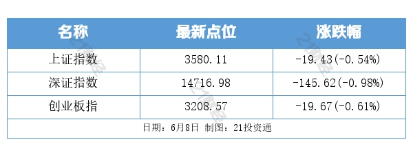 6月8日,A股三大指数集体收跌,其中沪指下跌0.54%,收报3580.11点;深证成指下跌0.98%,收报14716.98点;创业板指下跌0.61%,收报3208.57点,两市合计成交9854亿元,白酒概念股集体大跌。