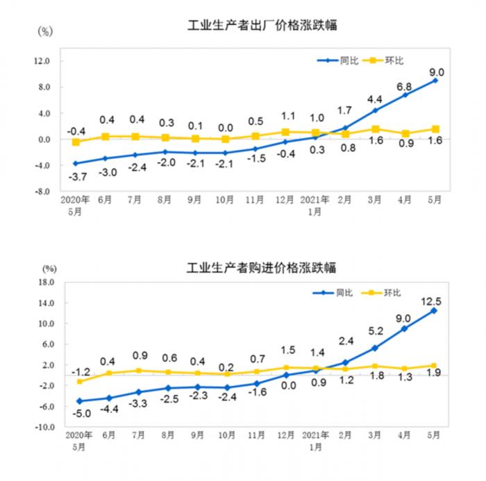 2021年5月份,全国工业生产者出厂价格同比上涨9.0%,环比上涨1.6%;工业生产者购进价格同比上涨12.5%,环比上涨1.9%。1—5月平均,工业生产者出厂价格比去年同期上涨4.4%,工业生产者购进价格上涨5.9%。