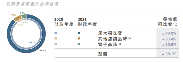 这也反映在周大福的业绩中。2021财年,周大福中国内地同店销售增长31.9%。