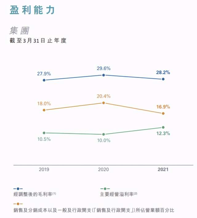 2021财年,周大福“主要经营利润率”为12.3%,较上一财年的10%上升。