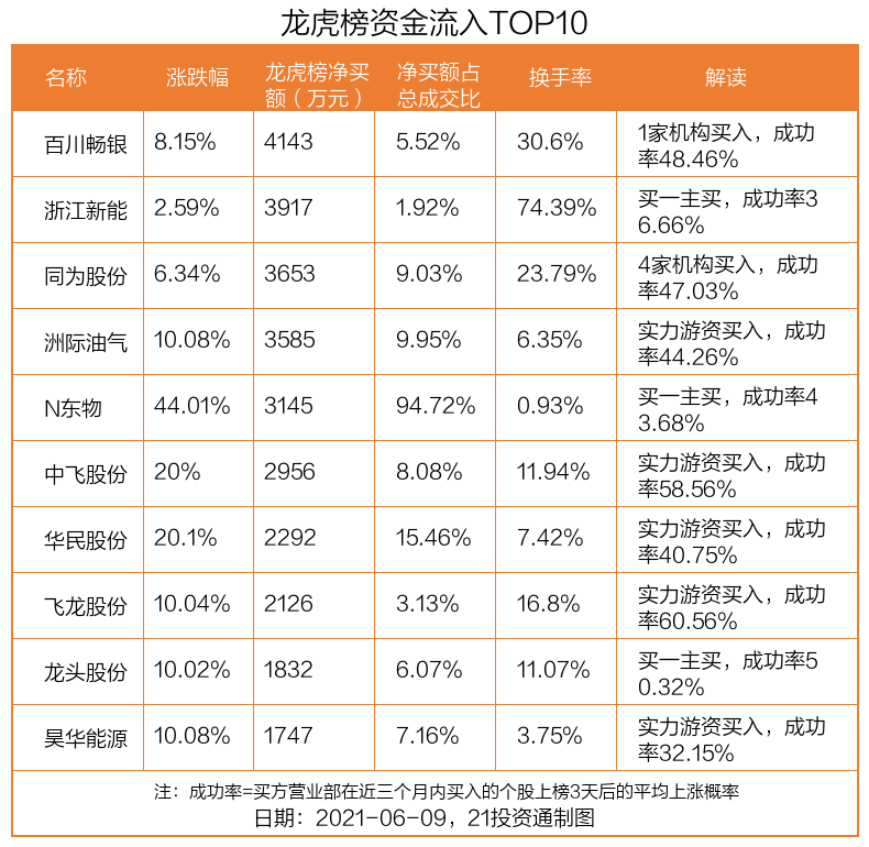 6月9日,上证指数上涨0.32%,深证成指上涨0.01%,创业板指下跌0.03%。盘后龙虎榜数据显示,共有36只个股因当日异动登上龙虎榜,资金净流入最多的是百川畅银(300614.SZ),为0.41亿元。