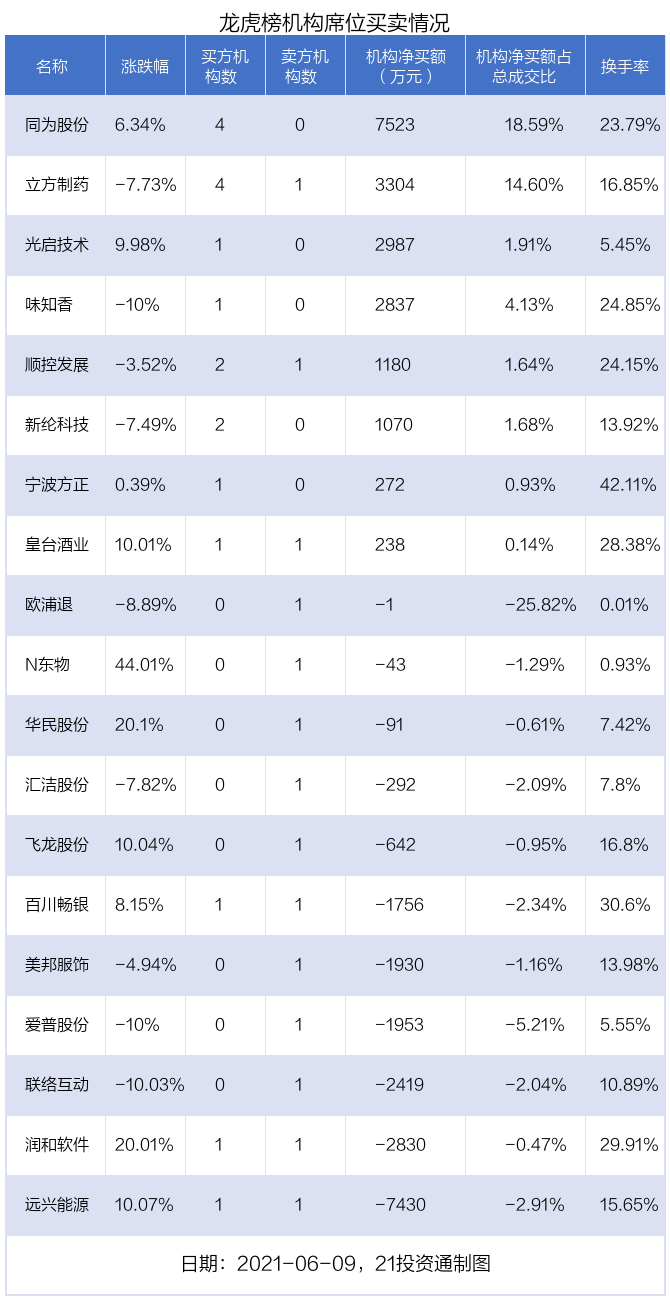 6月9日,19只个股龙虎榜出现了机构的身影,机构合计净买入24.2万元。具体来看,机构净买入8股,净卖出11股。