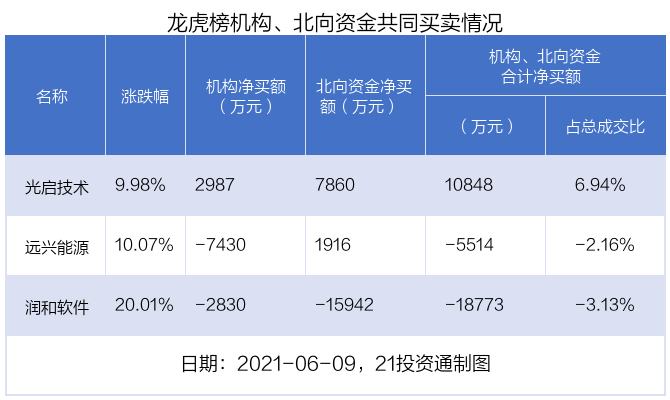 值得注意的是,机构和北向资金共同净买入了光启技术;共同净卖出了润和软件;在远兴能源上出现分歧,机构净卖出远兴能源7429.87万元,北向资金净买入1915.81万元。