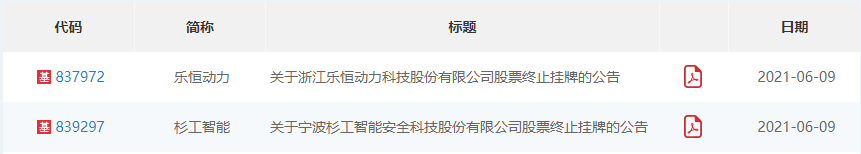 6月9日,全国股转公司消息,新三板基础层企业乐恒动力(837972)、杉工智能(839297)终止挂牌。