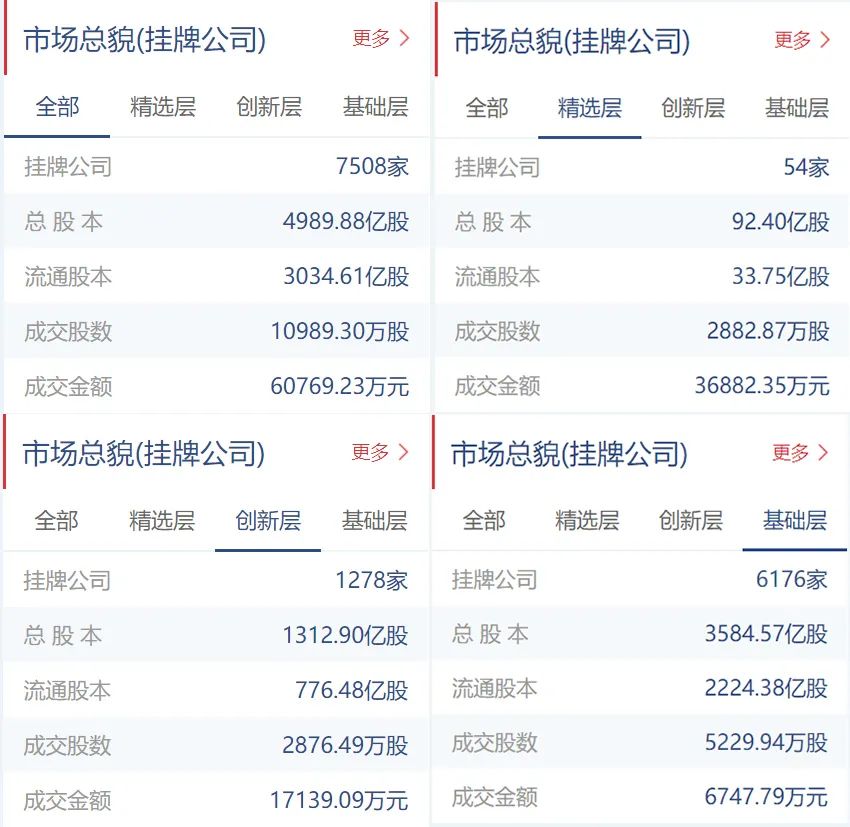 截至6月9日收盘,今日成交金额为6.08亿元,精选层成交金额为3.69亿元,创新层成交金额为1.71亿元,基础层成交金额为0.67亿元;今日成交股数为10989.30万股,精选层成交股数为2882.87万股,创新层成交股数为2876.49万股,基础层成交股数为5229.94万股。