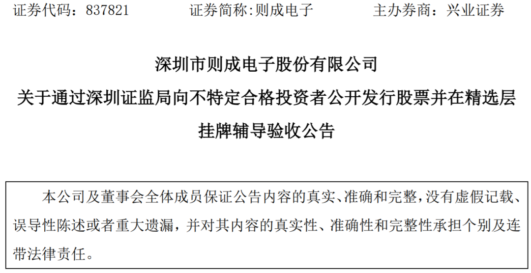 公告显示,则成电子于2020年6月24日在全国中小企业股份转让系统官网发布了《深圳市则成电子股份有限公司申请股票公开发行并在精选层挂牌辅导备案公告》,公司进入向不特定合格投资者公开发行股票并在精选层挂牌辅导阶段。