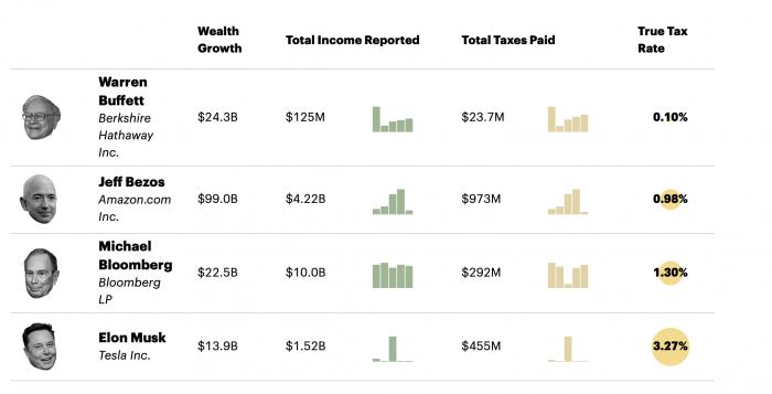 对比如此鲜明。按照福布斯榜单计算,2014年到2018年间,25位全美顶级富豪的身家累计增长4010亿美元,而美国国税局的数据显示,他们于这五年间共缴纳了136亿美元的联邦所得税,实际税率只有3.4%。