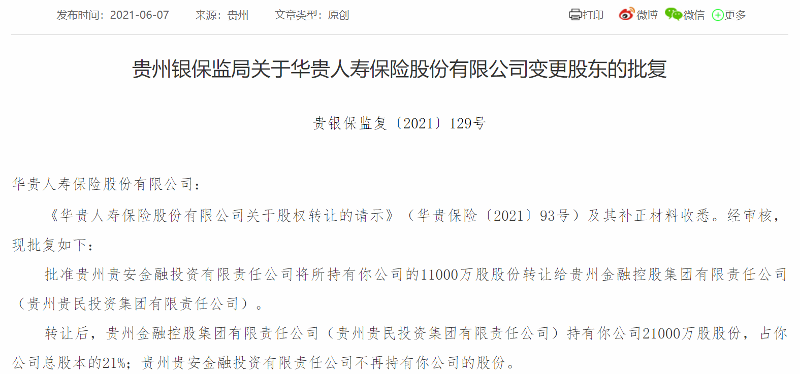 转让后,贵州金控持有华贵人寿2.1亿股股份,占华贵人寿总股本的21%;贵安金投则不再持有华贵人寿的股份。